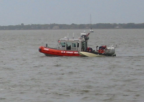 More high winds today….up to 55 miles per hour. Our instruments are already registering 40 knots. We noticed a Coast Guard boat racing by Cat Maudy. This is pretty unusual – since this is a no-wake zone and they usually travel very slowly near the marina. Not today. They were on a rescue mission.