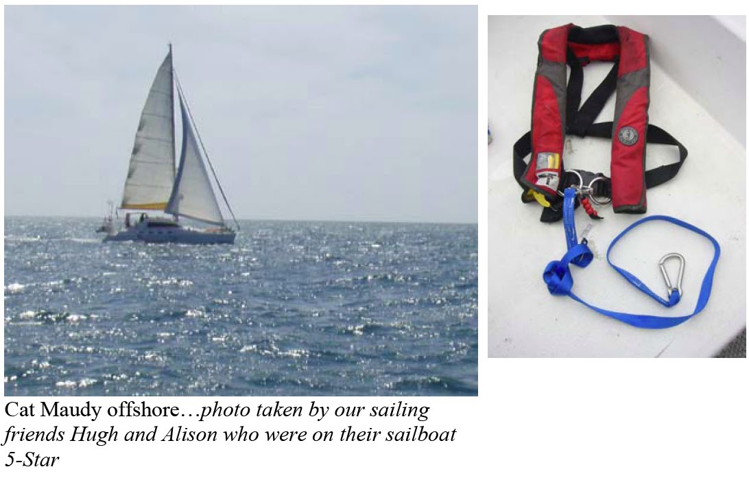 When sailing offshore – we have two added safety rules.1. mandatory to wear an offshore PFD (self inflates) at all times 2. always remain tethered to the boat. Each of our PFD’s has a 5′ tether line – allowing attachment on one end to the PFD…and the other end to any fixed object or jackline. Pat has setup a jackline (blue line that is connected around the perimeter of the boat) – so that if you have to go forward on deck — you are constantly attached to the boat.