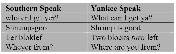 While Charleston hosts a mix of southern locals and transients, Georgetown seems to be the home of the native southerners. The southern drawl here is very pronounced, and it takes me an extra 20 seconds to digest what the heck people are saying. Try out some of these: