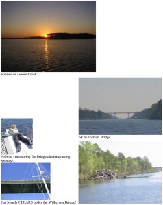 A tremendous sigh of relief – as Cat Maudy cleared the far side of the Wilkerson Bridge. With any luck – the wind tides would be diminished as we continued our journey to Norfolk — and we would not encounter any more problems with the 65′ fixed bridges. (so we hoped!) At bow – measuring the bridge clearance using Stanley! Cat Maudy CLEARS under the Wilkerson Bridge!