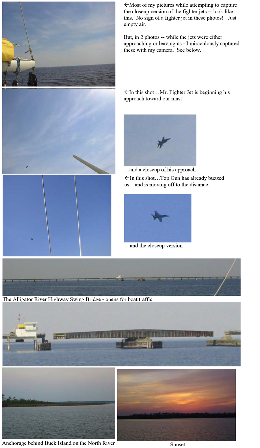 La-la-la-la-la….it is a beautiful day, light breezes and we are relaxing. The autohelm appears to be working again for the moment, and everything is lovely in the world of Cat Maudy – lazing along on a Friday afternoon in the Alligator River. We were in remote countryside – no houses, no cell phone service, no internet. We had the jib sail out – and gained about a knot of speed. When suddenly, out of the clear blue sky (literally!) – a US Air Force fighter jet traveling at what appeared to be super-sonic speeds roared less than 300 yards over our mast.