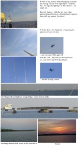 It was a bit unnerving to have a fighter jet swoop out of the ‘friendly skies’ toward your boat. Unfortunately, we found that the aggression was about to escalate. The skies are not so friendly today. For the next 10 minutes – this same US Air Force fighter jet — occasionally accompanied by one of his “Top Gun” fighter jet buddies….swooped, turned, and buzzed in and around our boat as if they were practicing how to terrorize pleasure boats on the ICW. They would dive down toward us, turn on their side in the final seconds….and disappear off into the horizon….only to reappear time after time. I tried to capture this on camera – our very own US government air force gone completely insane – taking on a catamaran trying to go north on the ICW. These fighter jets were so close to our boat – I could have seen their serial number – if it hadn’t been for the fact that they flew at warp speeds. While I took a ton of pictures – only 2 pictures shows a glimpse of the fighter jets (at further distance). My camera could not capture these jets at close range — within a split second they would disappear….and by the time my camera clicked…they were long gone.