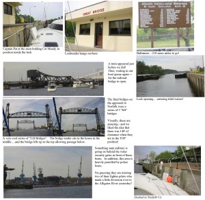 Great Bridge Lock. Yes, a 3rd structure in a row named Great Bridge. Definitely a lack of imagination here. However, going thru the lock was pretty cool. The Great Bridge Lock is a tidal guard — that lifts boats between tidal and non tidal waters. In our case — we would be entering INTO tidal waters. Southbound traffic would be entering into nontidal waters. You motor up to either the starboard or port side and tie up your boat to some very large pilings. The lock “lady” will help you get your lines around the big pilings. Basically, you then hold your boat when the front gates of the locks open. The water levels only change just over 2 ½ feet — so it is barely noticeable. You then untie your boat…and keep on motoring! About 10 more miles to go – and we will be in Norfolk.