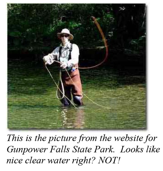Open water swim attempt #2 – Gunpowder Lake. The weekend before the Iron Girl — Jill, Emma and I trudged up to Gunpowder Falls State Park….to test drive our swim skills in open water. Now, trust me — Emma and Jill did not need to test their skills — they are both superb swimmers. This was a test for me. This is the picture from the website for Gunpower Falls State Park. Looks like nice clear water right? NOT!