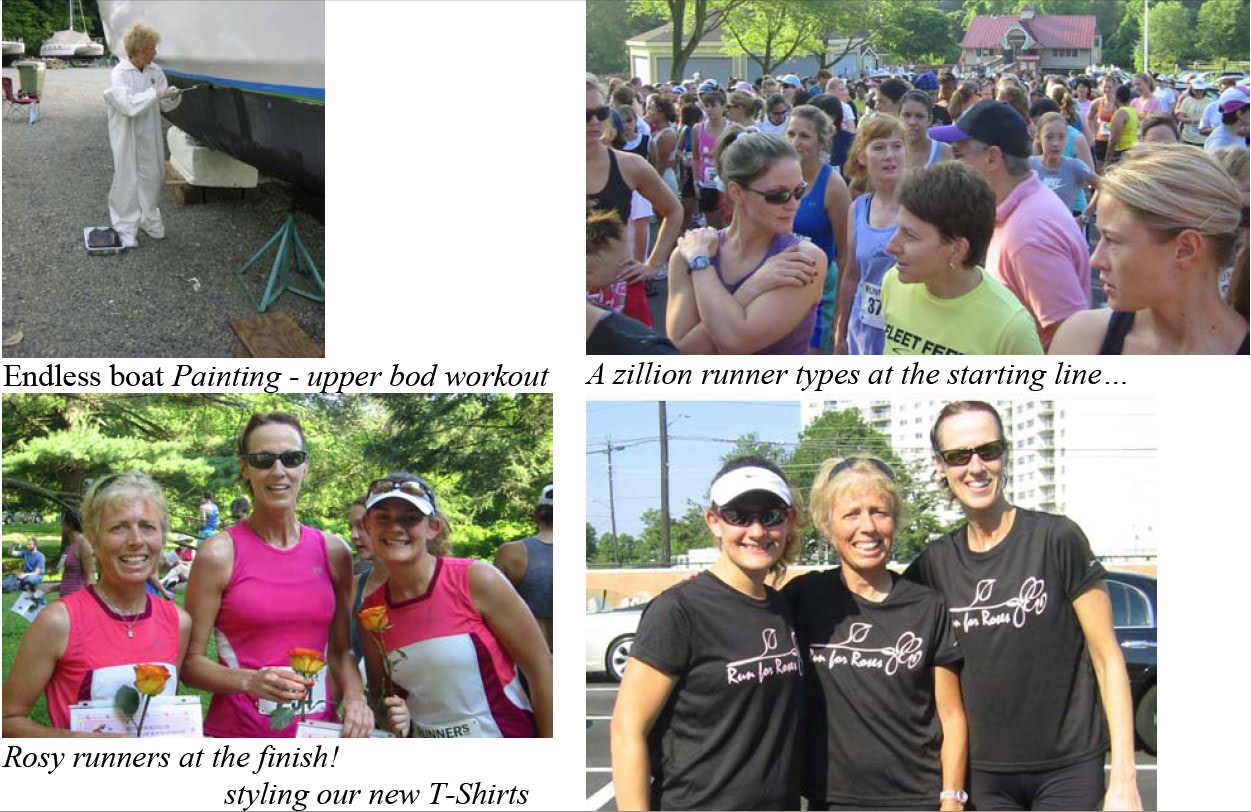 May / June 2008: TRI training season starts in earnest…Pat was keeping my upper bod fit with endless boat painting projects, and Emma and Jill got me into running races and “bricks”. Emma taught us new lingo. A “brick” is a back 2 back workout of 2 different activities….such as a bike ride, immediately followed by a run. We did lots of bricks. Bricks became the norm.. Luv the land sports. We even signed up for the “Run for the Roses” 5K run. (Mainly because the t-shirt bonus was pretty cool.) All is good. Let’s see how long I can procrastinate adding the swim component. Endless boat Painting – upper bod workout A zillion runner types at the starting line… Rosy runners at the finish! styling our new T-Shirts ??