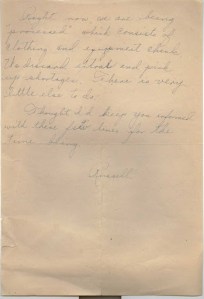 Just wanted to get these few lines off to you to let you know that I have begun the return trip. Consequently, don’t write any more letters. We will be at this depot anywhere from 8 to 30 days, although we were told that we are scheduled to leave in about a week — which would be the 12th. From here we go to the port for another few days, wait.