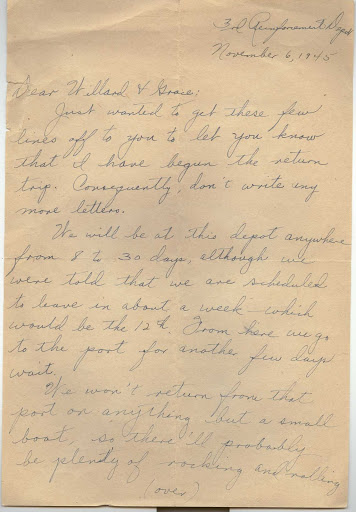 Just wanted to get these few lines off to you to let you know that I have begun the return trip. Consequently, don’t write any more letters. We will be at this depot anywhere from 8 to 30 days, although we were told that we are scheduled to leave in about a week — which would be the 12th. From here we go to the port for another few days, wait.