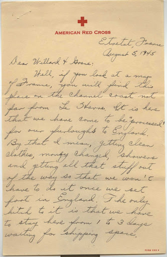 Well, if you look at a map of France, you will find this place on the channel coast not far from Le Havre. It is here that we have come to be “processed” for our furloughs to England. By that I mean, getting clean clothes, money changed, showers and getting all that stuff out of the way so that we won’t have to do it once we set foot in England. The only hitch to it is that we have to stay here from 1 to 3 days waiting for shipping space.