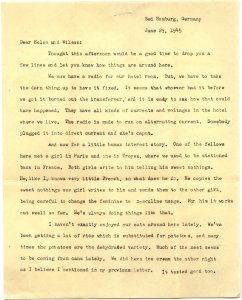 And now for a little human interest story. One of the fellows here met a girl in Paris and one in Troyes, where we used to be stationed back in France. Both girls write to him telling him sweet nothings. He, like I, knows very little French, so what does he do. He copies the sweet nothings one girl writes to him and sends them to the other girl, being careful to change the feminine to masculine usage. For him it works out swell so far. He’s always doing things like that.