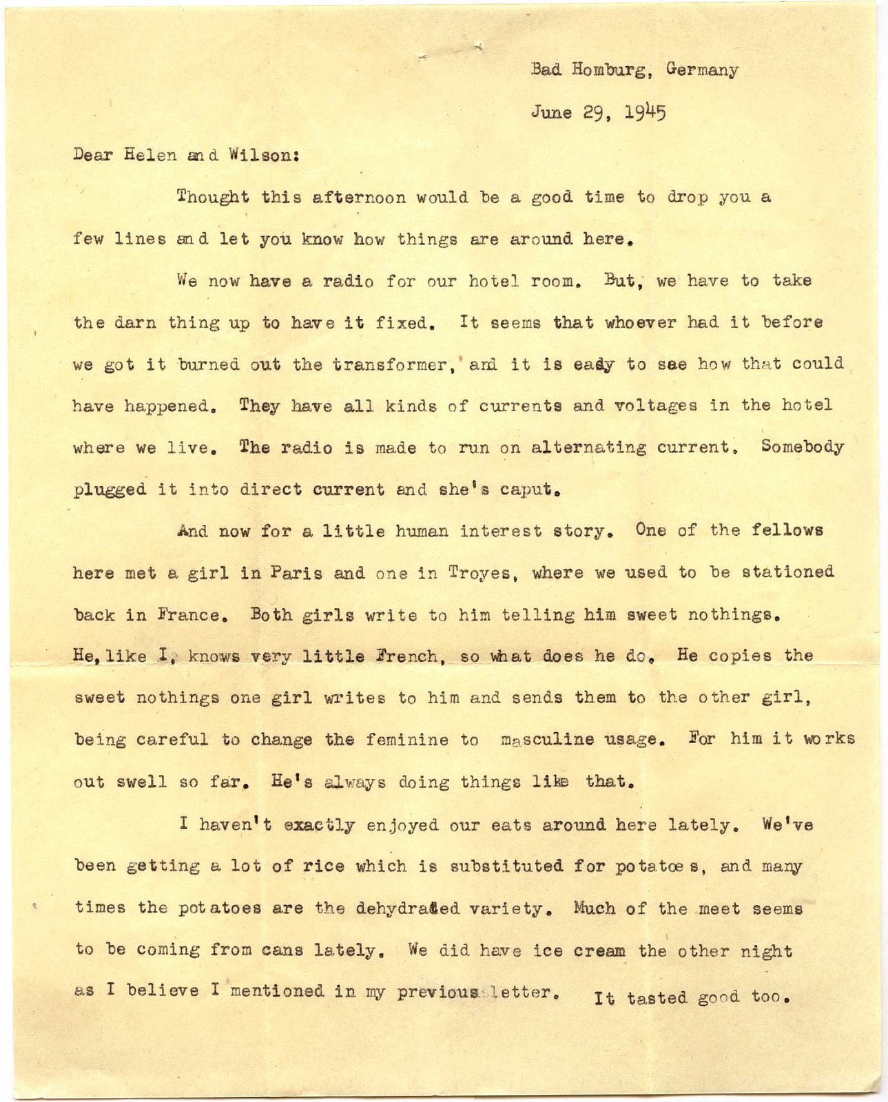 And now for a little human interest story. One of the fellows here met a girl in Paris and one in Troyes, where we used to be stationed back in France. Both girls write to him telling him sweet nothings. He, like I, knows very little French, so what does he do. He copies the sweet nothings one girl writes to him and sends them to the other girl, being careful to change the feminine to masculine usage. For him it works out swell so far. He’s always doing things like that.