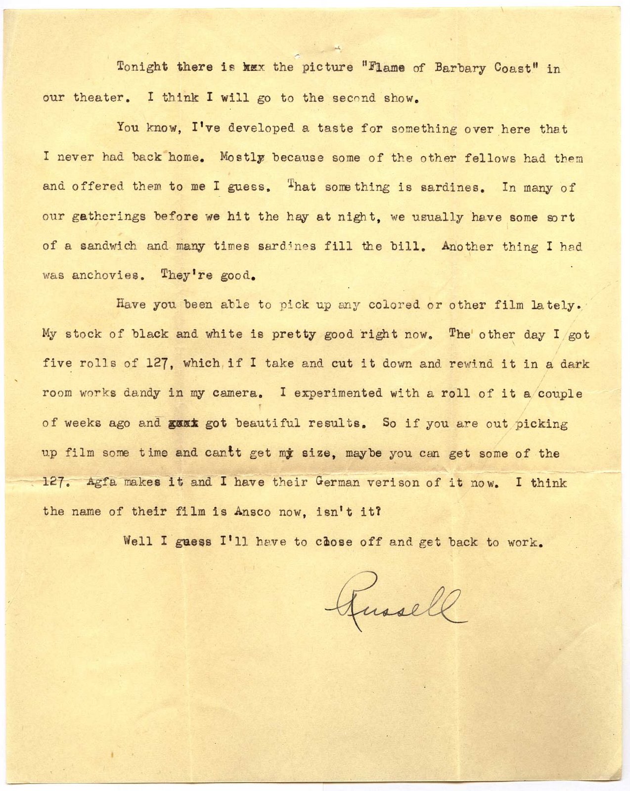 Tonight there is the picture “Flame of Barbary Coast” in our theater. I think I will go on the second show.