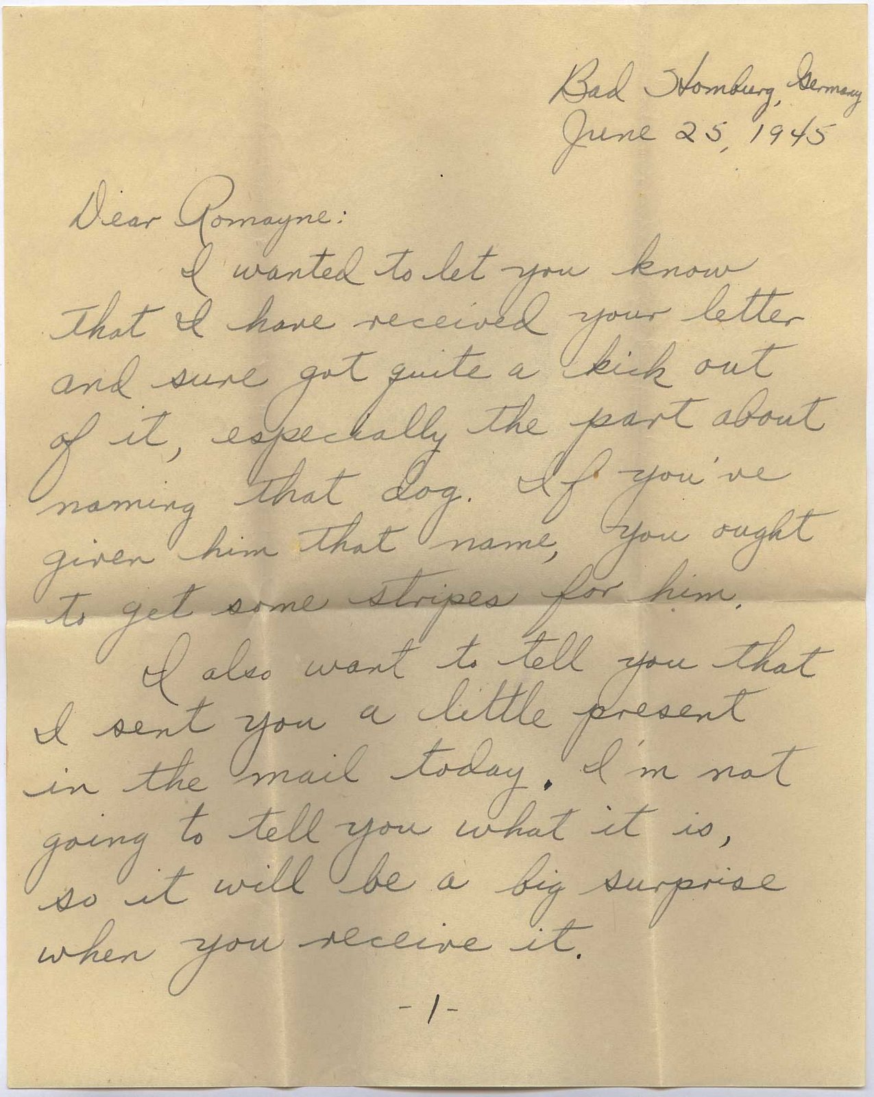 I wanted to let you know that I have received your letter and sure got quite a kick out of it, especially the part about naming that dog. If you’ve given him that name, you ought to get some stripes for him.