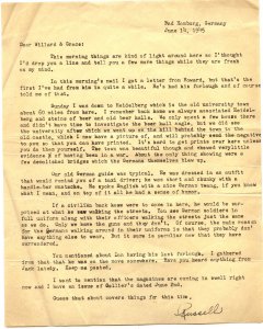 Sunday I was down to Heidelberg which is the old university town about 60 miles from here. I remember back home we always associated Heidelberg and steins of beer and old beer halls. We only spent a few hours there and didn’t have time to investigate the beer hall angle, but we did see the university after which we went up on the hill behind the town to the old castle, which I now have a picture of, and will probably send the negatives to you so that you can have printed. It’s hard to get prints over here unless you do them yourself. The town was beautiful though and showed very little evidence of having been in a war. About the only thing showing were a few demolished bridges which the Germans themselves blew up.