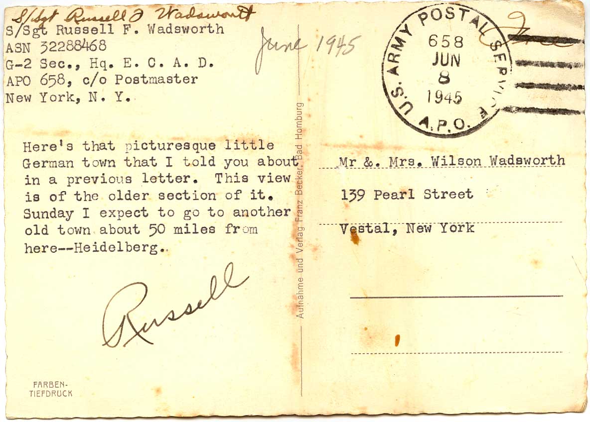 Here’s that picturesque little German town that I told you about in a previous letter. This view is of the older section of it. Sunday I expect to go to another old town about 50 miles from here — Heidelberg.