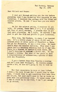 This town, Bad Homburg, is where I am located now. It’s a little place of about 16,000 and is located about 10 miles north of Frankfurt a. Main. Now as for Frankfurt, it was a nice city. At least that’s what the remains indicate. From what I saw there isn’t a building standing that is of any use. There is a theatre in operation down there, but I don’t know how it escaped a direct hit. It was damaged a little. But most of the place is just a conglomeration of silhouettes.– ghosts of what once was Frankfurt.