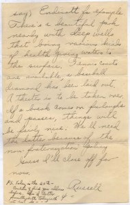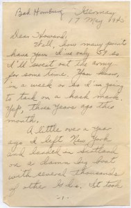The town itself is picturesque, neat, clean modern. And from a personal viewpoint, those are all the typical German traits. It’s really a lot like say Endicott for example. There’s a beautiful park nearby with deep wells that bring various kinds of health giving water to the surface. Tennis courts are available, a baseball diamond has been laid out. A theatre is to be taken over. If a break comes on furlough and passes things will be fairly nice. We’ll need the latter because of the not-fraternization policy.