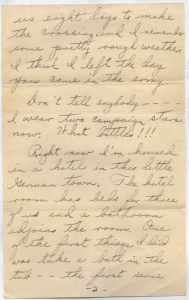 Right now I’m housed in a hotel in this little German town. The hotel room has beds for three of us and a bathroom adjoins the rooms. One of the first things I did was take a bath in the tub — the first since I left England in a tub.