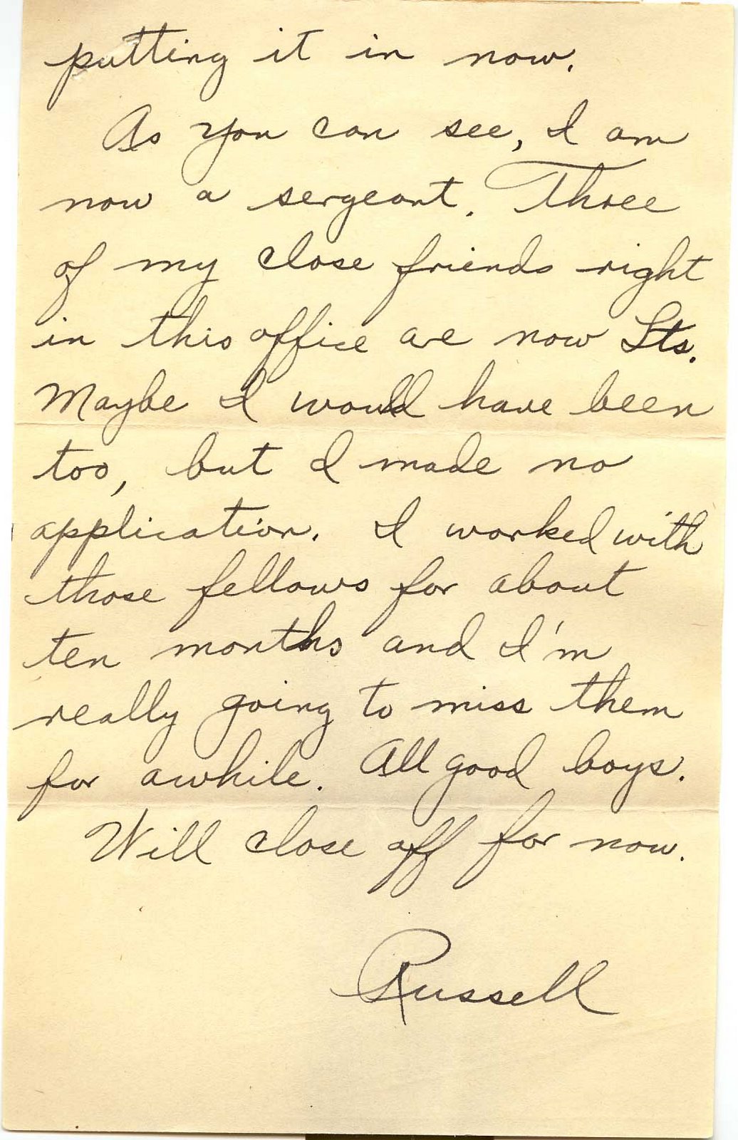 As you can see, I am not a sergeant. Three of my close friends right in this office are now Lt’s. Maybe I would have been too, but I made no application. I worked with those fellows for about ten months and I’m really going to miss them for awhile. All good boys.