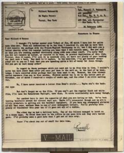 I thought I’d better answer your V-Mail of January 26 which I’ve had for quite some time now. From all indications up to the time I received it, you had no word that I did receive the package with the French-English dictionary in it, but I did mail you a letter shortly after it’s receipt letting you know that I did receive same. Now you tell me that you’re sending another dictionary along with some other stuff. I’m sorry that you did not receive my letter, or receive it in time, to prevent duplication of this item. However, when it comes, I’ll sell it to somebody else as there are plenty of guys looking for just such a book. How much is it anyhow. In the meantime, I’ll get another money order off to you as I feel that you are spending quite a bit of money for these things. Did you get my last money order?