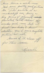 Haven’t had any mail for several days now, but neither has anyone else. Won’t have any for a few days yet, and then there’ll probably be a lot of it. I have received several packages that I never expected, and if every guy over did as well, it can be readily understood why mail might be delayed. Most of us in here did well in that respect.