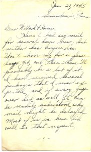 I am enclosing some pictures in this letter, some which I took in England, and some which were taken by other fellows. That picture of the tent in the thickest pines is the one I slept in for some time since coming over here. Notice how we put sides on it, and built it up. Some of the pictures were taken in the office. I have sent in some that I took in color. They haven’t been returned yet. Pass ’em around, but don’t lose them.