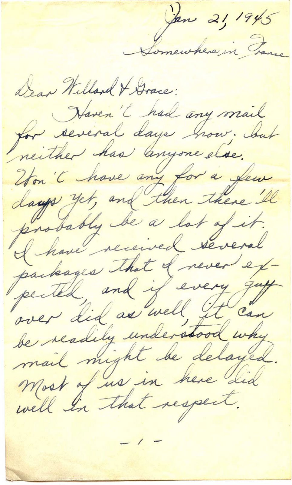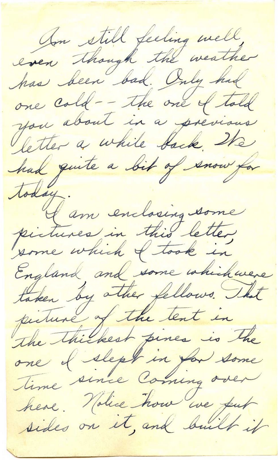 I am enclosing some pictures in this letter, some which I took in England, and some which were taken by other fellows. That picture of the tent in the thickest pines is the one I slept in for some time since coming over here. Notice how we put sides on it, and built it up. Some of the pictures were taken in the office. I have sent in some that I took in color. They haven’t been returned yet. Pass ’em around, but don’t lose them.
