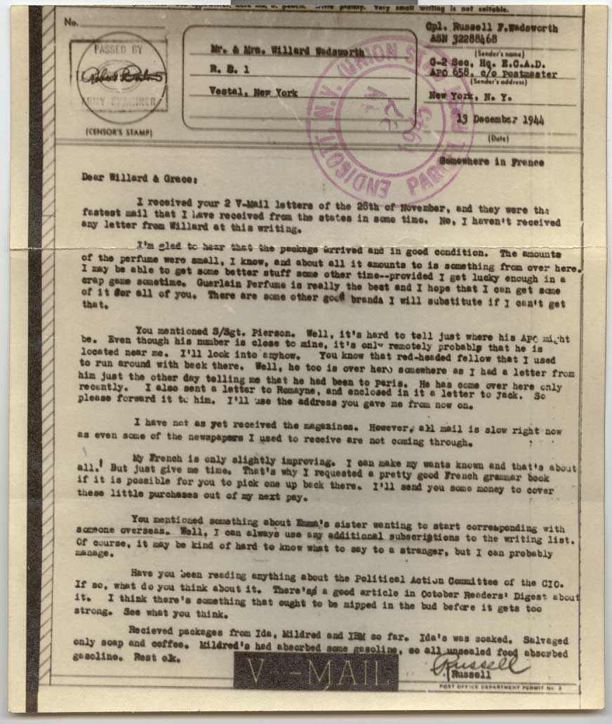 I received your 2 V-Mail letters of the 28th of November, and they were the fastest mail that I have received from the states in some time. No, I haven’t received any letter from Willard at this writing.