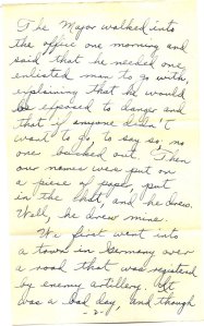 The Mayor walked into the office one morning and said that he needed one enlisted man to go with, explaining that he would be exposed to danger and that if anyone didn’t want to go, to say so, no one backed out. Then our names were put on a piece of paper, put in the hat, and he drew. Well, he drew mine.
