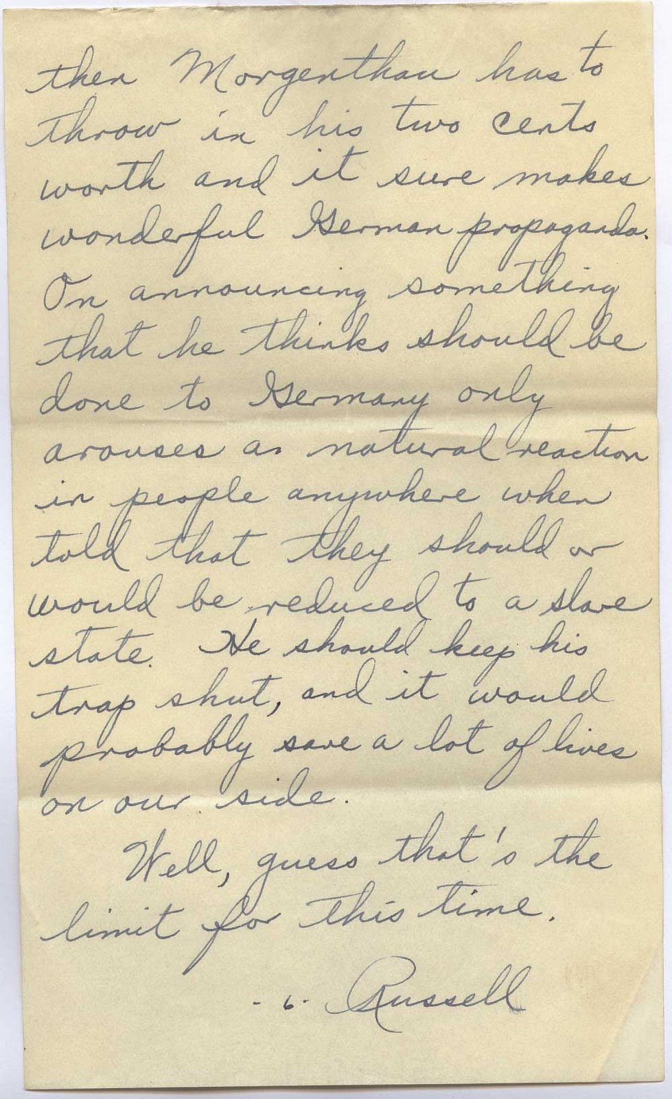 You know, our side is after an unconditional surrender and the Germans have known that for a long time and are making us fight for it. But then Morgenthau has to throw in his two cents worth and it sure makes wonderful German propaganda. On announcing something that he thinks should be done to Germany only arouses a natural reaction in people anywhere when told that they should or would be reduced to a slave state. He should keep his trap shut, and it would probably save a lot of lives on our side.