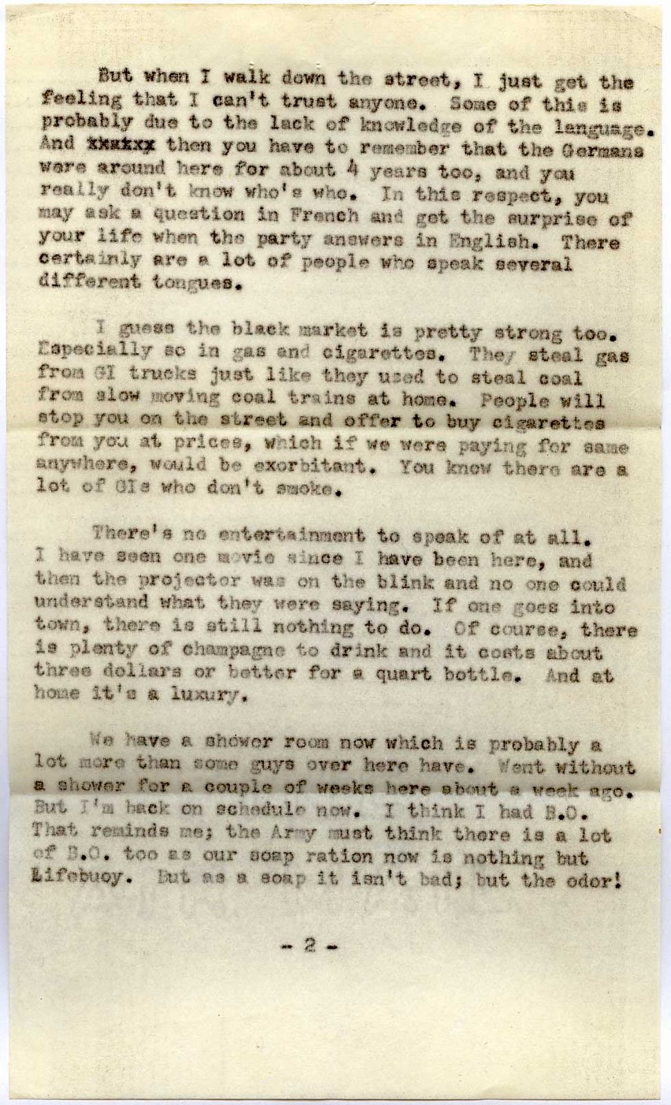 But when I walk down the street, I just get the feeling that I can’t trust anyone. Some of this is probably due to the lack of knowledge of the language. And then you have to remember that the Germans were around here for about 4 years too, and you really don’t know who’s who. In this respect, you may ask a question in French and get the surprise of your life when the party answers in English. There certainly are a lot of people who speak several different tongues.