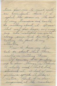 Anyway, on the way here, I was separated from my baggage — the only clothes I had were those I wore. Naturally, that was the time for me to meet with an accident. Sure!! I split the seam in the seat of my trousers and could do nothing about it. It was that way for days, and every guy who watched me walk away sure did his duty in calling the fact to my attention.