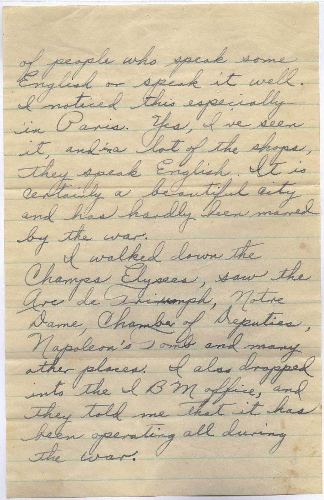 I walked down the Champs Elysees, saw the Arc de Triumph, Notre Dame, Chamber of Deputies, Napoleon’s Tomb and many other places. I also dropped into the IBM office, and they told me that it has been operating all during the war.