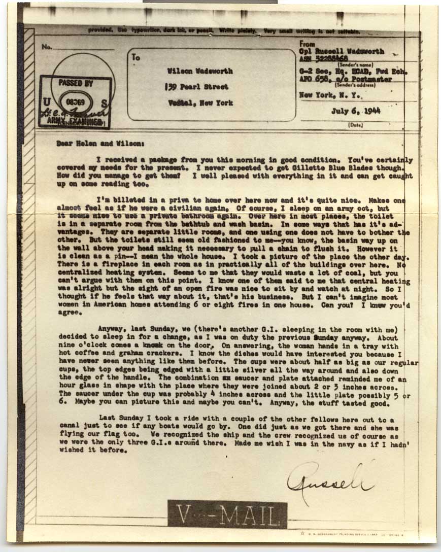 Anyway, last Sunday, we (there’s another G.I. sleeping in the room with me) decided to sleep in for a change, as I was on duty the previous Sunday anyway. About nine o’clock comes a knock on the door. On answering, the woman hands in a tray with hot coffee and graham crackers. I know the dishes would have interested you because I have never seen anything like them before. The cups were about half as big as our regular cups, the top edges being edged with a little silver all the way around and also down the edge of the handle. The combination of saucer and plate attached reminded me of an hour glass in shape with the place where they were joined 2 to 5 inches across. The saucer under the cup was probably 4 inches across and the little plate possibly 5 or 6. Maybe you can picture this and maybe you can’t. Anyway the stuff tasted good.