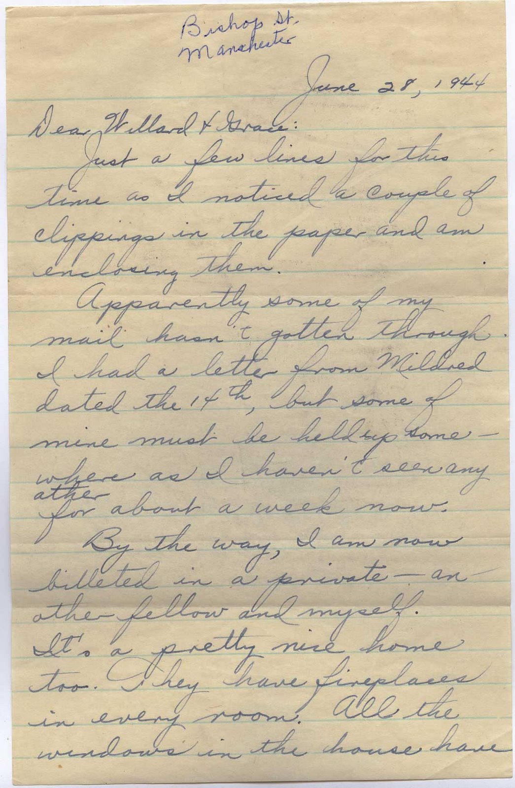 By the way, I am now billeted in a private – an other fellow and myself. It’s a pretty nice home too. They have fireplaces in every room. All the windows in the house have some sort of design painted on them. I used to think the glass was cut fancy, but the illusion came from seeing these designs. The couple keep the place as neat as a pin too. But we still sleep on army cots. To be able to wash and clean up in a bathroom is the least I ever expected to do over here outside of a hotel.