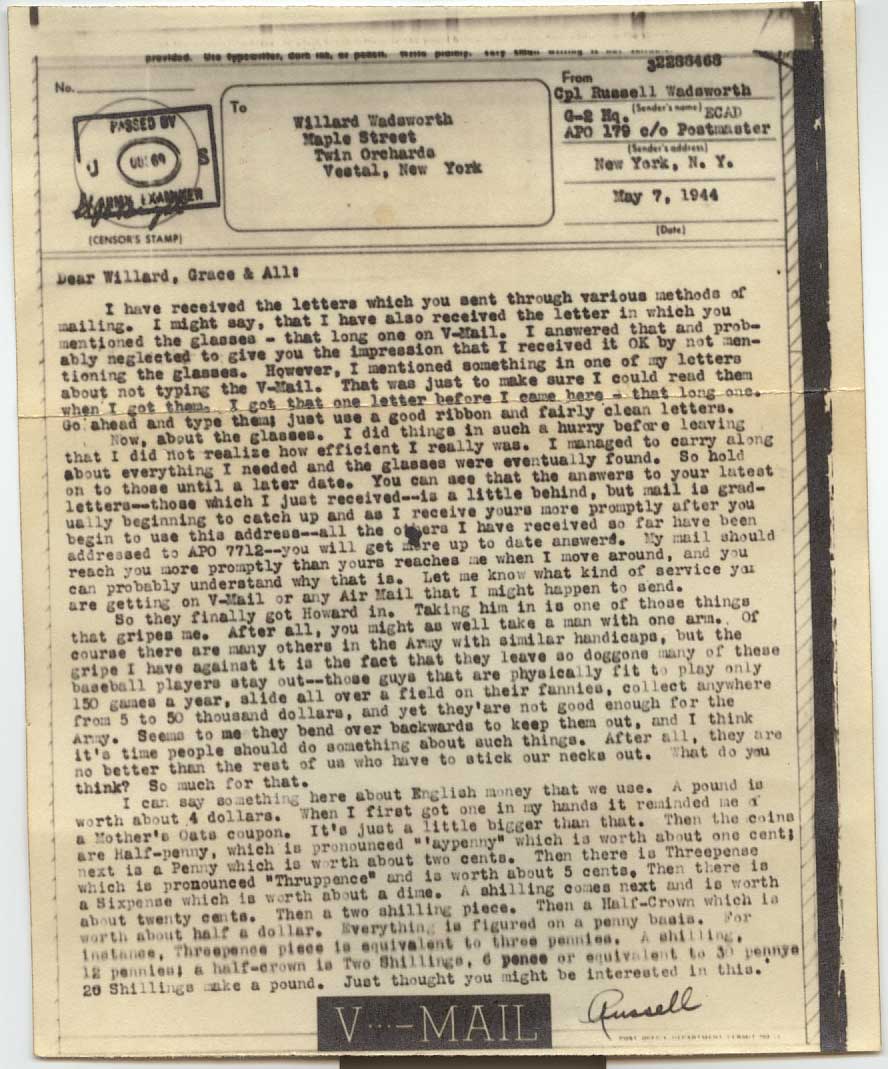 I have received the letters which you sent through various methods of mailing. I might say that I have also received the letter in which you mentioned the glasses – that long one on V-Mail. I answered that and probably neglected to give you the impression that I received it OK by not mentioning the glasses. However, I mentioned something in one of my letters about not trying the V-Mail. That was just to make sure I could read them when I got them. I got that one letter before I came here – that long one. Go ahead and type them just use a good ribbon and fairly clean letters.