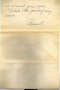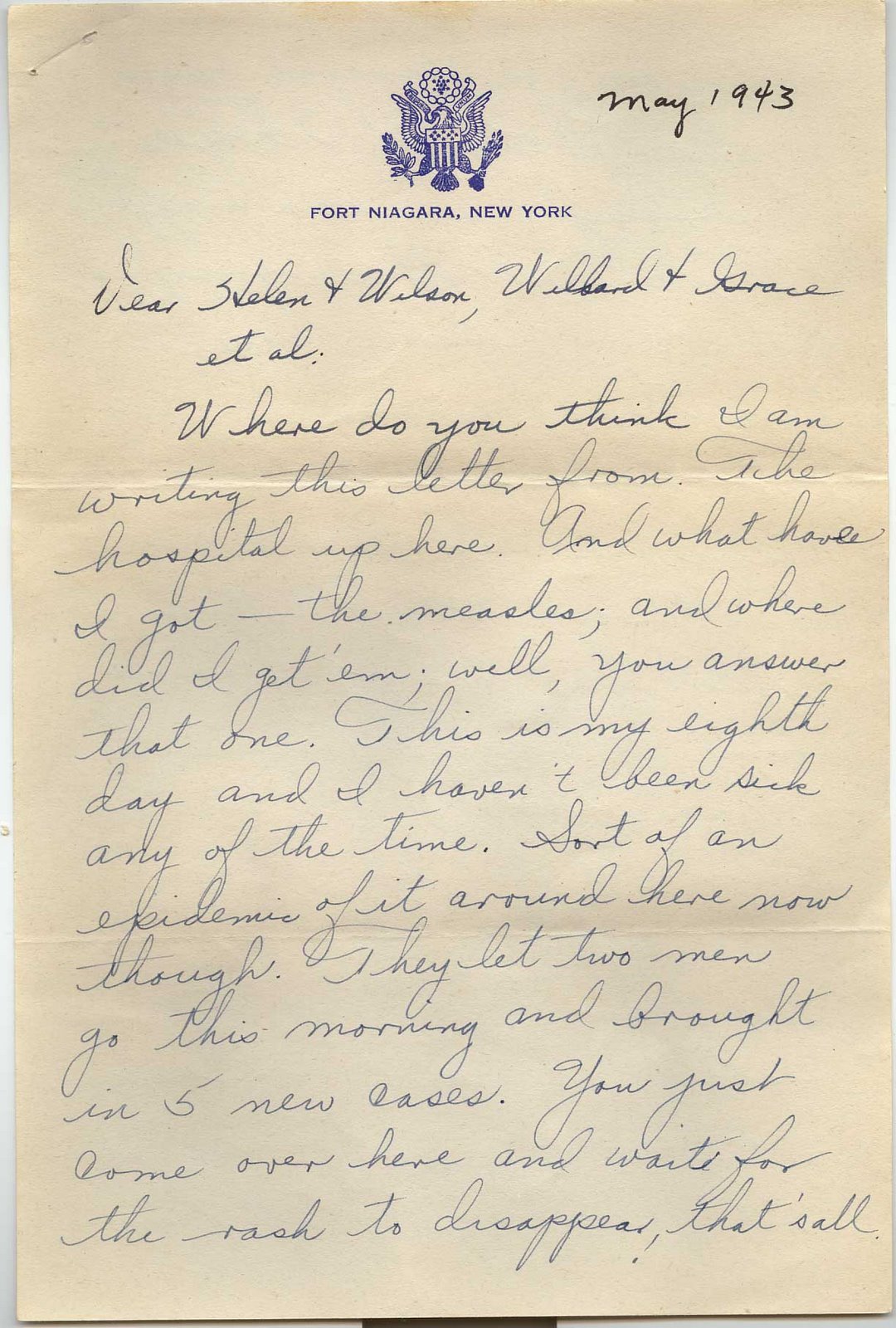 Where do you think I am writing this letter from. The hospital up here. And what have I got – the measles; and where did I get ’em; well, you answer that one. This is my eighth day and I haven’t been sick any of the time. Sort of an epidemic of it around here now though. They let two men go this morning and brought in 5 new cases. You just come over here and wait for the rash to disappear that’s all.