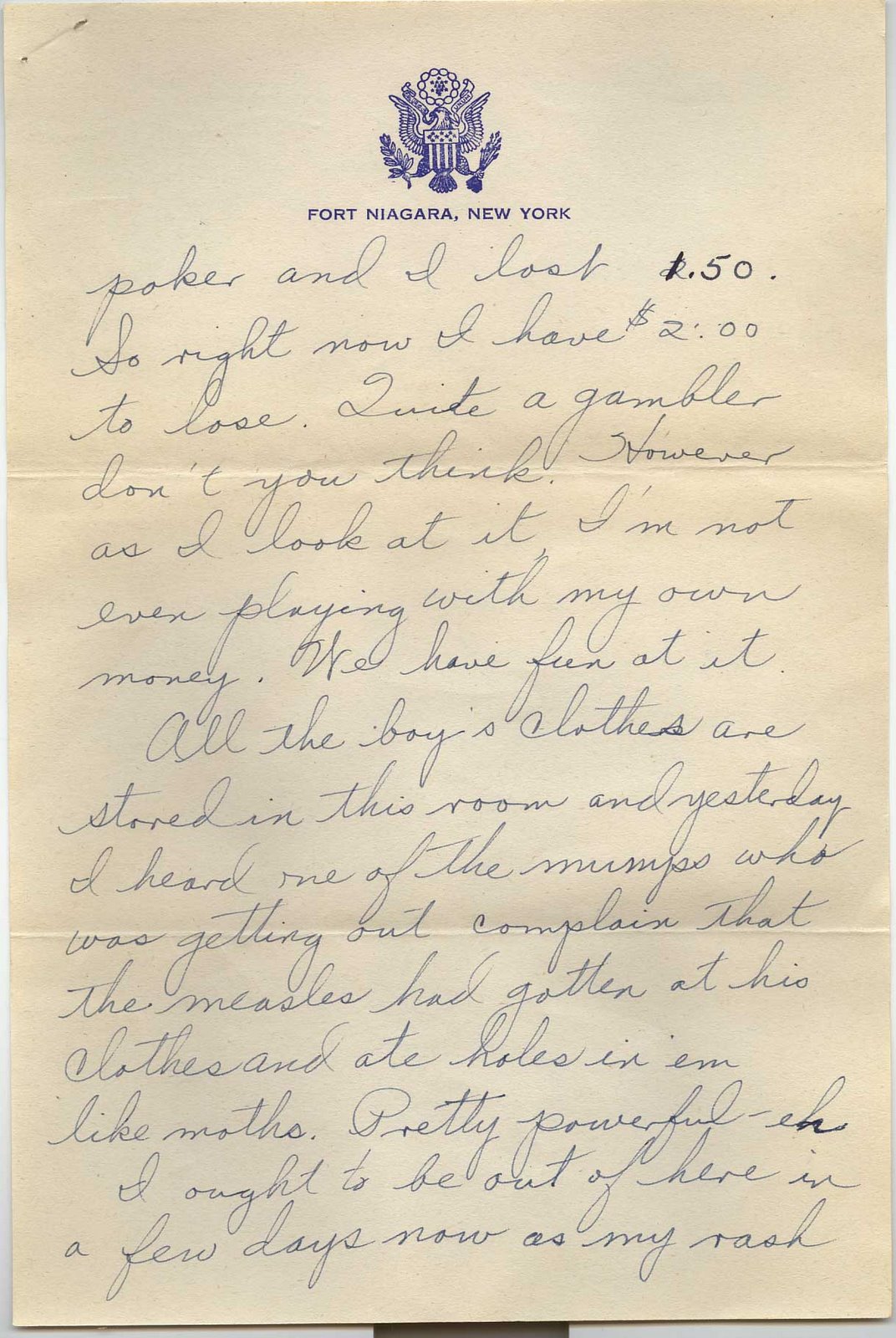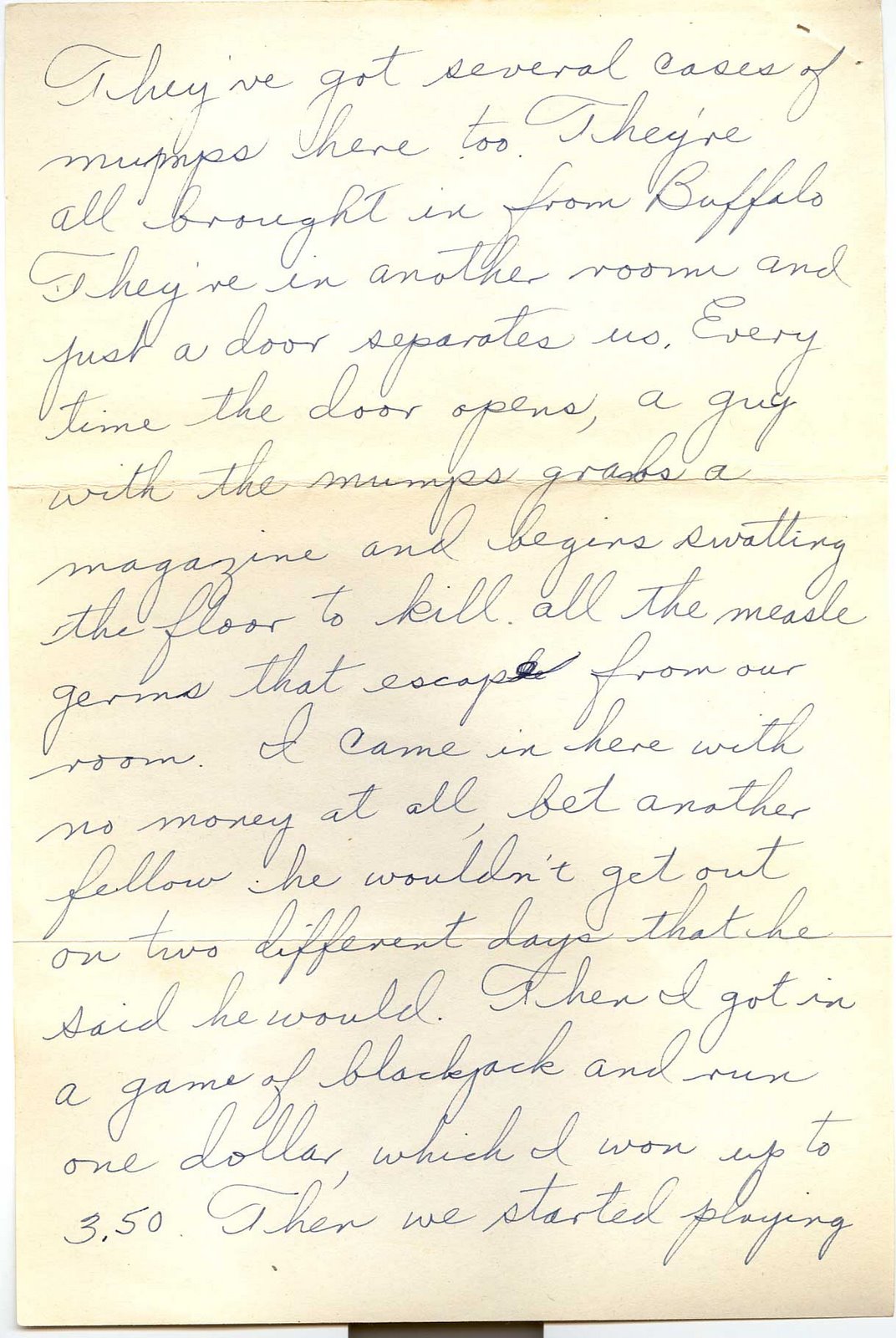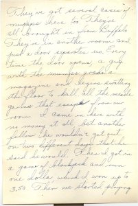 They’ve got several cases of mumps here too. They’re all brought in from Buffalo. They’re in another room and just a door separates us. Every time the door opens, a guy with the mumps grabs a magazine and begins swatting the floor to kill all the measles germs that escape from our room. I came in here with no money at all, bet another fellow he wouldn’t get out on two different days that he said he would. Then I got in a game of blackjack and run one dollar, which I won up to 3.50. Then we started playing poker and I lost 1.50. So right now I have $2.00 to lose. Quit a gambler don’t you think. However as I look at it I’m not even playing with my own money. We have fun at it.