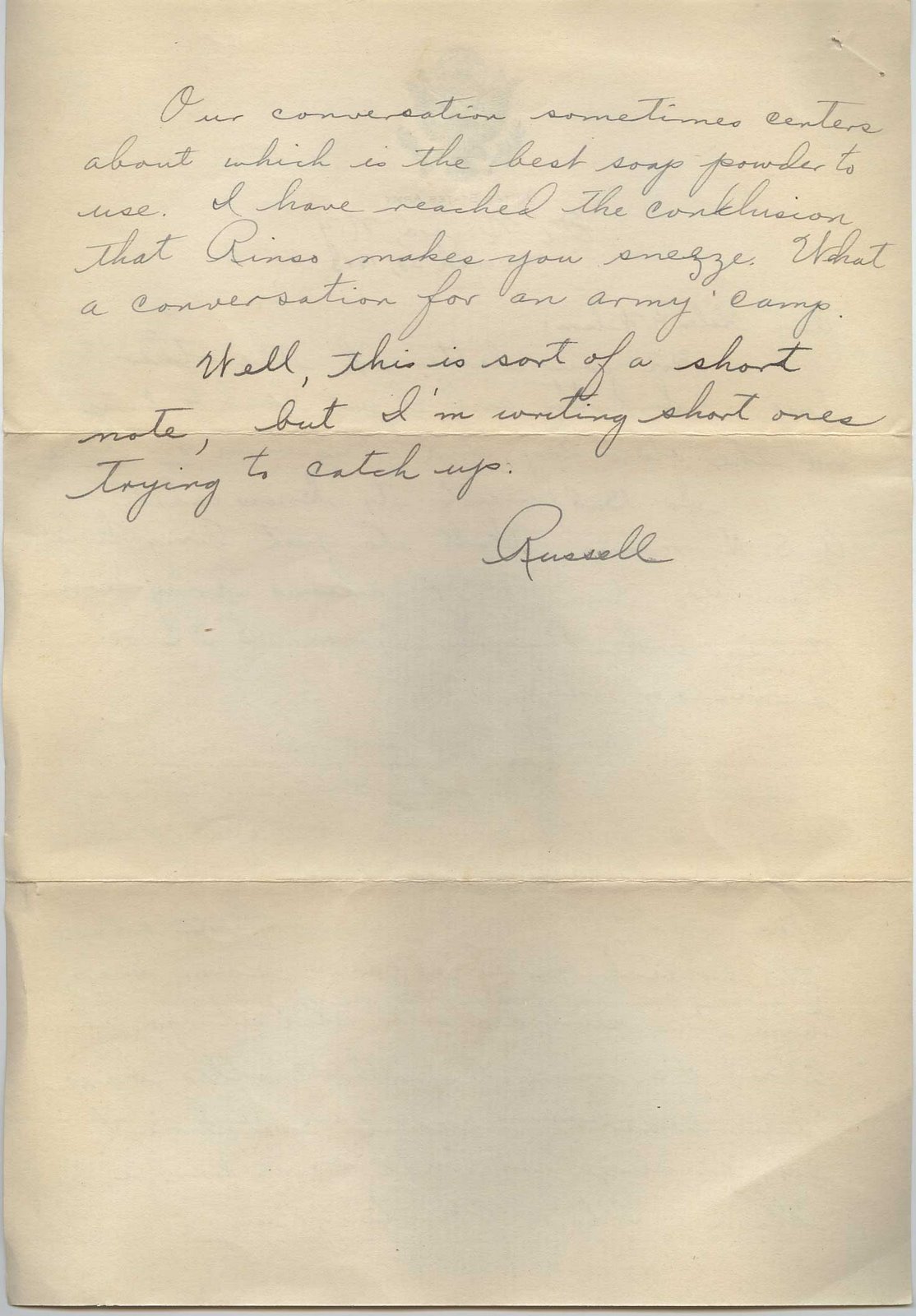 Our conversation sometimes centers about which is the best soap powder to use. I have reached the conclusion that Rinso makes you sneeze. What a conversation for an army camp.