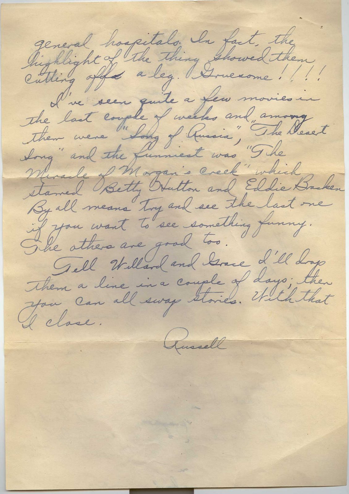 I’ve seen quite a few movies in the last couple of weeks and among them were “Song of Russia”, “The Desert Song” and the funniest was “The Miracle of Morgan’s Creek” which starred Betty Hutton and Eddie Bracken. By all means try and see the last one if you want to see something funny. The others are good too.