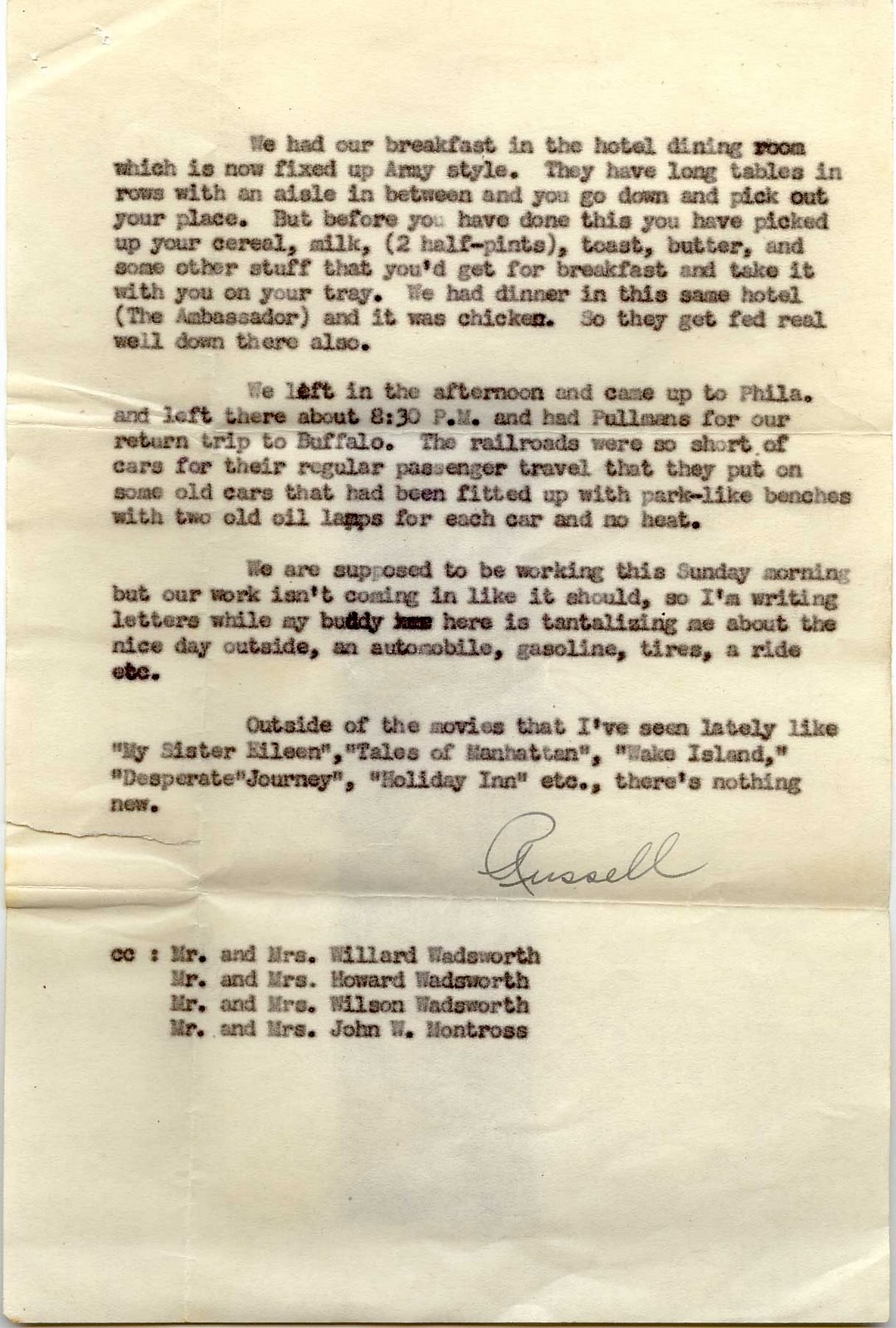 We left in the afternoon and came up to Phila. and left there about 8:30PM and had Pullmans for our return trip to Buffalo. The railroads were so short of cars for their regular passenger travel that they put on some old cars that had been fitted up with park-like benches with two old oil lamps for each car and no heat.