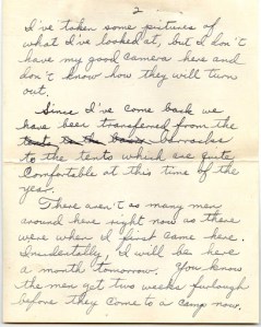 Since I’ve come back we have been transferred from the barracks to the tents which are quite comfortable at this time of the year.