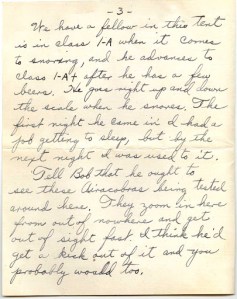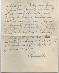 Howard’s mother-in-law and her daughter were up here last Sunday and found me watching a ball game. They were lucky to find me because we don’t stick around the tents much during the day on Sunday, and that is because some corporal or sergeant may come in and want you to do something. Nobody likes to do anything on Sunday.