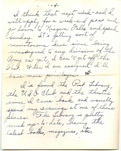 Tell Bob that he ought to see these Airacobras being tested around here. They zoom in here from out of nowhere and get out of sight fast. I think he’d get a kick out of it and you probably would too. I think that next week-end I will apply for a weekend pass and go down to Niagara Falls and spend Sunday. It’s getting sort of monotonous here since being unassigned to any division of the Army as yet, I can’t get off the Post. When I am assigned I’ll have more privileges.