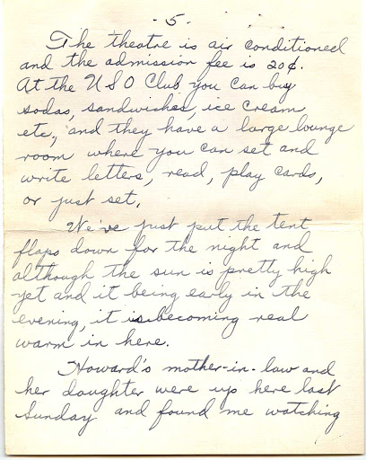 The theatre is air conditioned and the admission fee is 20 cents. At the USO Club you can buy sodas, sandwiches, ice cream etc, and they have a large lounge room where you can set and write letters, read, play cards, or just set.