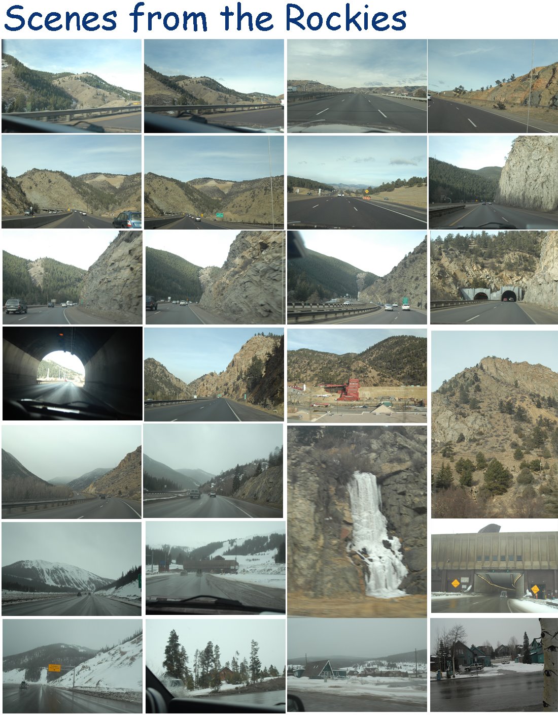 The “climb” from the valley of Denver…to the lower mountains was downright jaw dropping…only to be surpassed by the climb into the upper elevations. Words cannot do justice to this amazing scenery. You need to make sure you have a full tank of gas when you get started, and have a lot of faith that not only YOUR car…but all of the other cars and trucks around you have been carefully tuned for good working brakes…for the steep descents. At our highest point just before Loveland Pass, we reached 10,000 feet elevation….and then descended to steep, snow blown roadways. The weather went from sunny and warm in Denver…to blizzard like conditions in the peaks. (below is footage from the beginning of the climb out of Denver – to Breckenridge)
