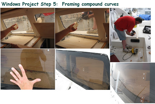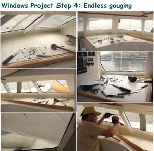 The salon window replacement project began in “concept” – last fall. Without adequate weather or temperatures, windows replacement waited until the following spring. Spring felt more like monsoon season in the tropics. We waited, and continued to revise our plans for constructing window frames. We thought we had lined up a boat yard to assist – but big dollar signs became apparent ($20-$30K) – we realized that we would have to tackle this project ourselves. Weeks away from the official declaration of “summer”, we armed ourselves with “how to” info from the Internet, calls to the sikaflex tech support guy, and a collection of kitchen knives.