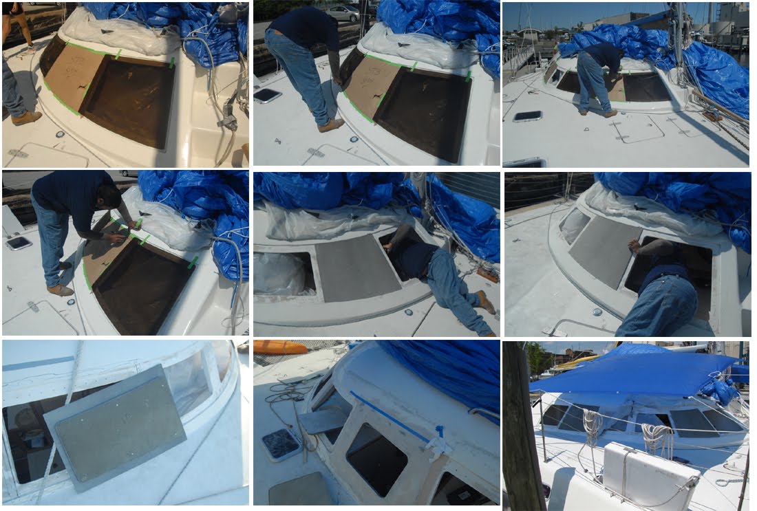 With our salon window redesign underway by repairman Clifton at Tidewater – molds of the new window hatches, grinding and fiberglass dust all added to our blue-tarp under construction “look”. It also made Cat Maudy unlivable.
