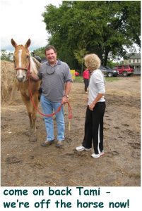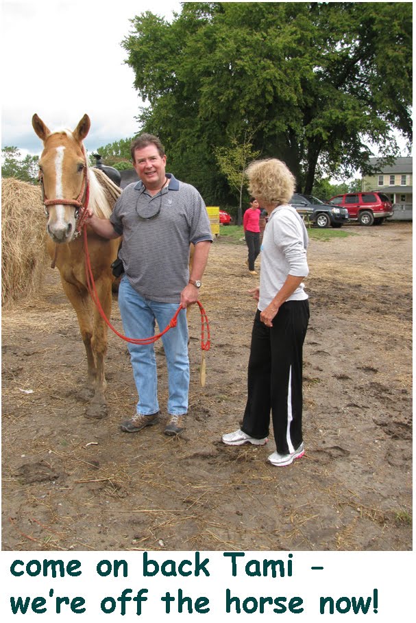 As we passed along the wide open field, with the riding stable in sight…TWO HOURS from when we started this adventure…my only thought was “how quickly could I get off of Winston?”. Tami interrupted that thought – and immediately informed the farm folks that she needed to be FIRST off her horse. Before I knew it, Tami had dismounted and made a 100 yard dash for the car.
