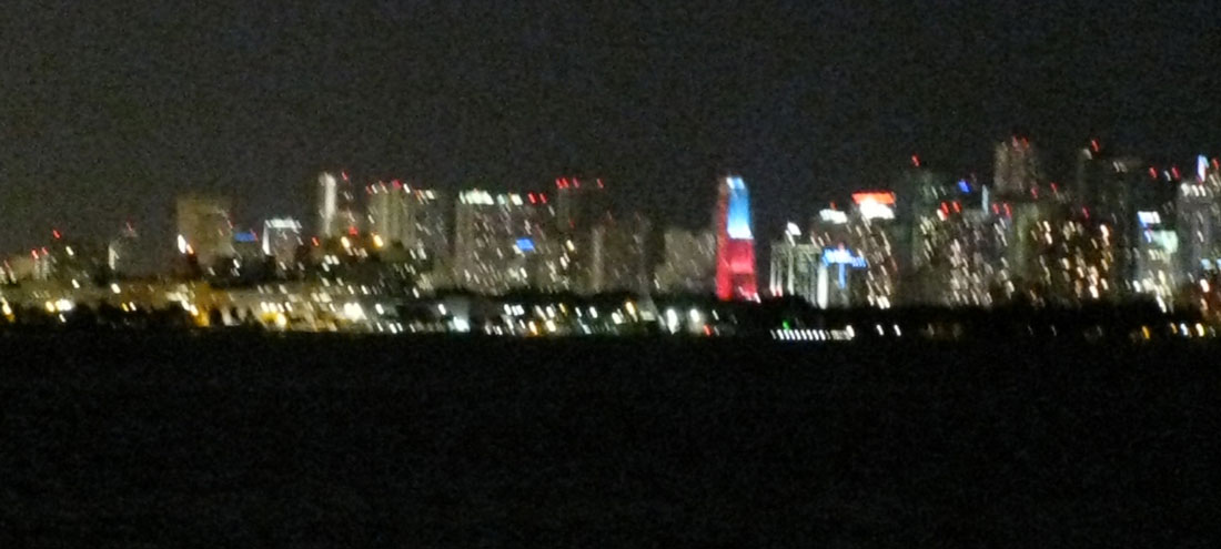 As we rounded the barrier island (which protects the docked boats at the Dinner Key Marina) , we were met with a WALL of waves. Woa. Big ones when you are in a dinghy. It was dark. The winds were blowing 25 knots from the east. And, I sat, holding on to 3 bags of belongings, and holding up a mini flashlight as our Nav light.