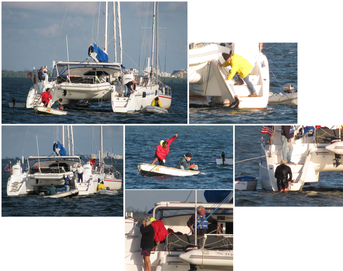 Captain Juan – on one of the dinghies….is poised and ready. He takes over the diving…and after 30 or so dives…comes to the same conclusion. The anchor line needs to get cut free. The owner is reached via cell phone. He insists that another anchor gets added to his spider web of existing 5-10 anchors. Captain Larry and his team of dinghy captains obliges. The troublesome anchor line is cut….a new anchor is dropped…and Chateau limps away from the monohull and its spider web of anchors.